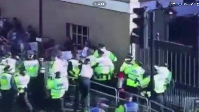 Mluvčí řekl: „Když se důstojníci nastěhovali, aby je zastavili, čelili nepřijatelnému násilí. Byly napadeny kopy a údery. Byly hozeny láhve, světlice a další projektily.
