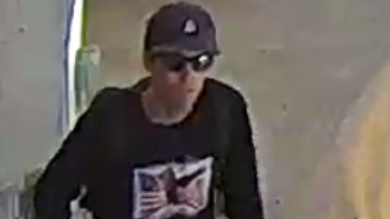 Obrázky ukazují někoho, kdo měl na sobě černou baseballovou čepici, černou košili s dlouhým rukávem, černé kalhoty a sluneční brýle.