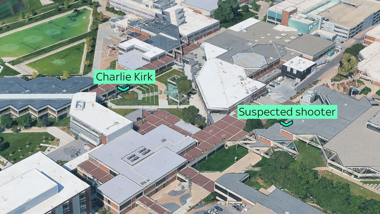 Sky News pomocí videí pořízených poblíž jeviště dokázala potvrdit, že tato pozice má přímou pohled na místo, kde Kirk v době útoku seděl.