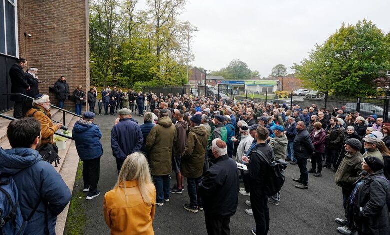 Lidé se shromáždili před hebrejským shromážděním Heaton Park v Crumpsall v 9:30, čas útok minulý čtvrtekmodlit se a truchlit oběti.