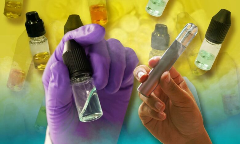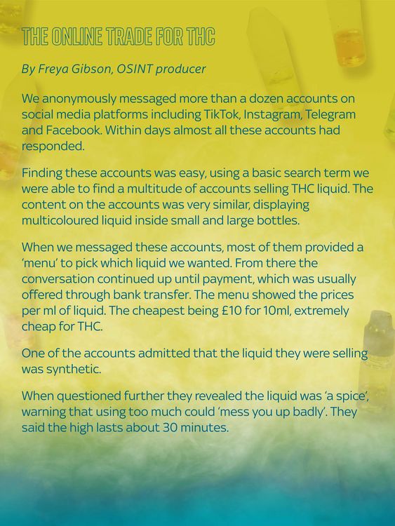 Nelegální vape tekutiny – často pestrobarevné – jsou inzerovány na Tiktok, Facebook a Instagram jako THC, psychoaktivní složka konopí, která je ve Velké Británii zakázána.