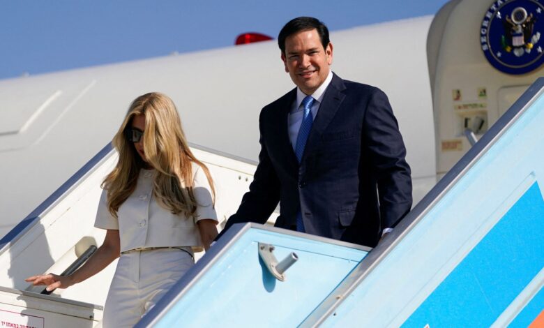 Americký ministr zahraničí Marco Rubio a jeho manželka Jeanette Dousdebes Rubio se v neděli v Izraeli dotkli, když dříve novinářům řekl, že prezident nebyl „šťastný“ s izraelskou stávkou.