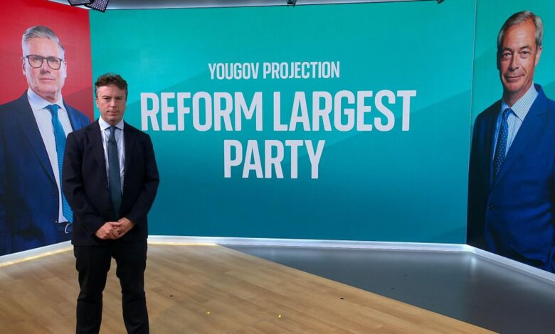 Projekce hlasování YouGov MRP, založená na 13 000 vzorcích převzaté za poslední tři týdny, naznačuje, že volby, které se konají zítra, by zaznamenalo zavěšený parlament s reformou UK, který získal 311 ze 650 křesel, 15 křesel krátce od formálního výherní linie 326.