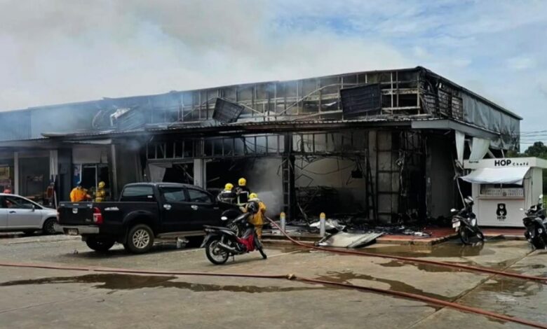 Hasiči se snaží uhasit palbu v obchodě s pohodlí na benzínové stanici v Kantharalaku v Thajsku.  Pic: TPBS/Reuters