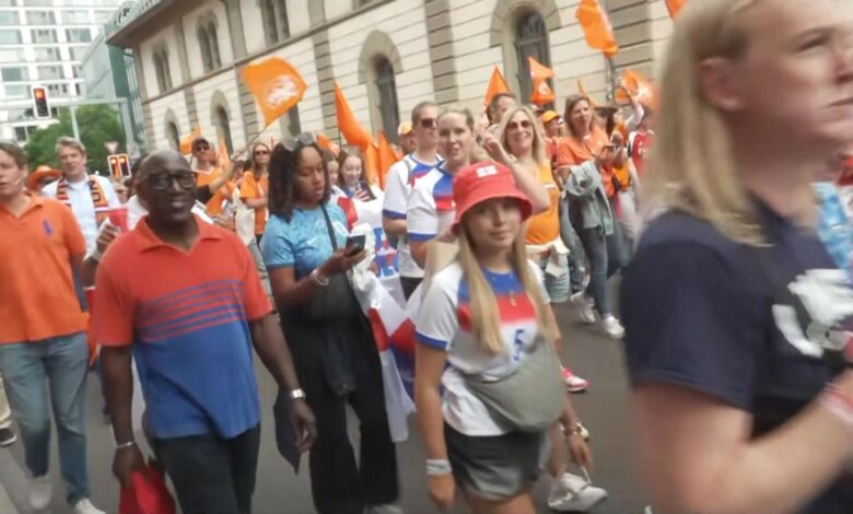 Když holandští fanoušci oranžově oblečeni pochodovali na stadion Curych, aby tento týden hráli Anglii, jejich soupeři byli povzbuzováni, aby se připojili k průvodu.