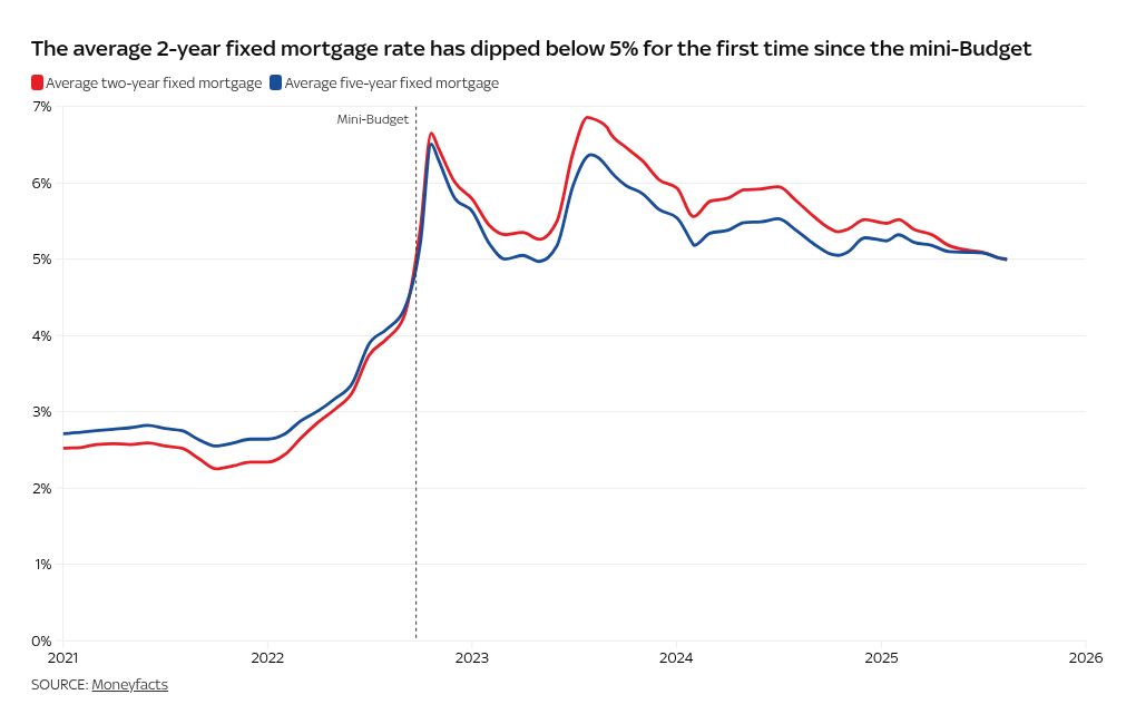 Průměrná dvouletá hypoteční sazba klesla po poprvé pod 5% od mini-rozpočtu Liz Truss.