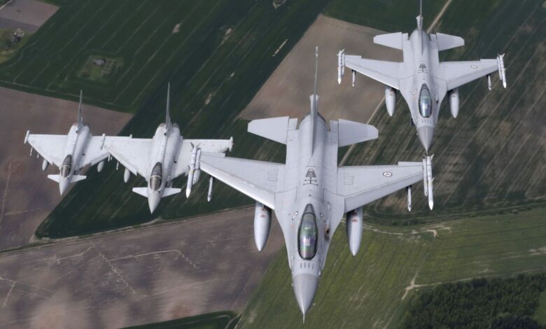 NATO podrobně popisuje skromný počet dalších vojenských aktiv – včetně dvou stíhacích letounů F -16 a fregatu z Dánska, tří stíhacích letounů Rafale z Francie a čtyř letounů Eurofighter z Německa.