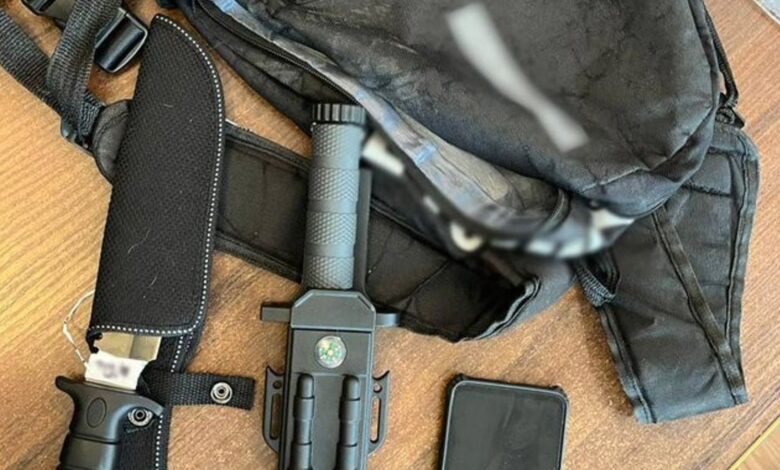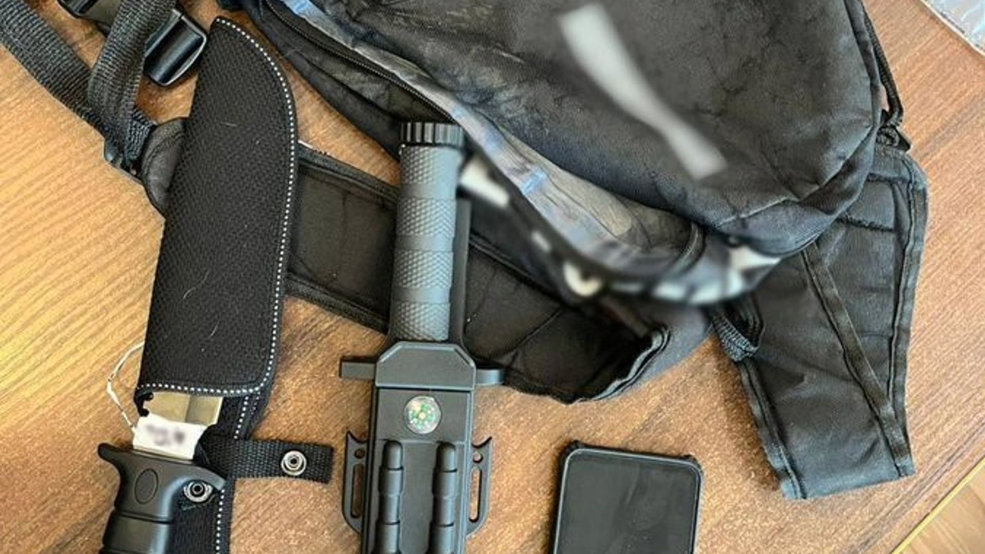 Byl doprovázen obrazem nože, telefonu a batohu zabaveného policií na místě činu.