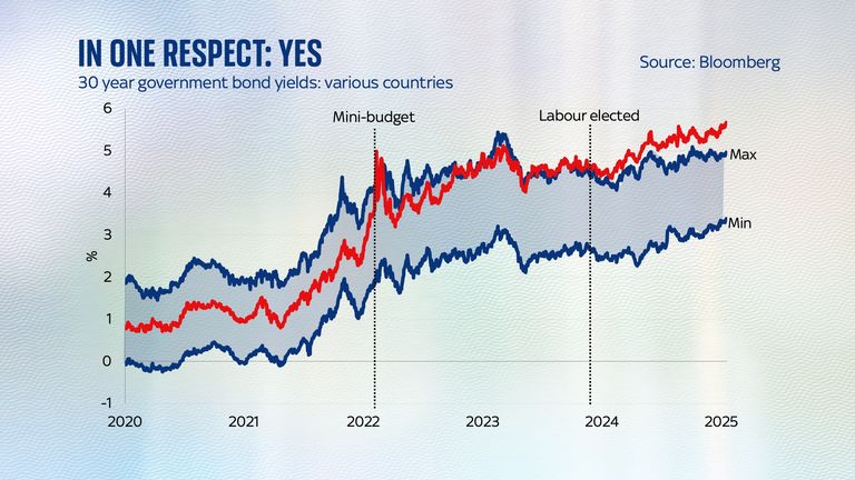 Vláda neprošla některé klíčové legislativy výdaje na sociální zabezpečení. Rovněž musela provést otočení u snižování zimních plateb paliva. Tato dvě rozhodnutí znamenají, že v nadcházejících letech zůstane značná díra ve veřejných financích. To zase zvyšuje větší pravděpodobnost, že si bude muset půjčit více, což znamená, že by se investoři mohli více bát zadluženosti Británie. To je zcela v souladu s vyššími zlacenými výnosy. A tak možná není žádným překvapením, že 30letý výnos Spojeného království je výrazně vyšší než jiné národy G7.