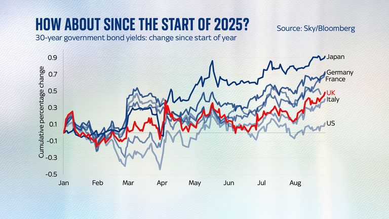 Vláda neprošla některé klíčové legislativy výdaje na sociální zabezpečení. Rovněž musela provést otočení u snižování zimních plateb paliva. Tato dvě rozhodnutí znamenají, že v nadcházejících letech zůstane značná díra ve veřejných financích. To zase zvyšuje větší pravděpodobnost, že si bude muset půjčit více, což znamená, že by se investoři mohli více bát zadluženosti Británie. To je zcela v souladu s vyššími zlacenými výnosy. A tak možná není žádným překvapením, že 30letý výnos Spojeného království je výrazně vyšší než jiné národy G7.